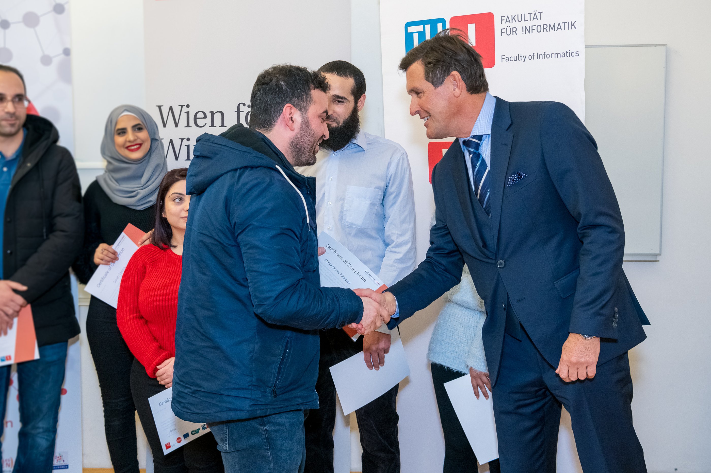 Twelve young refugees received their final certificates by Dean H. Werthner and the City Councillor for Finance, Economics and Digitalisation, P. Hanke.