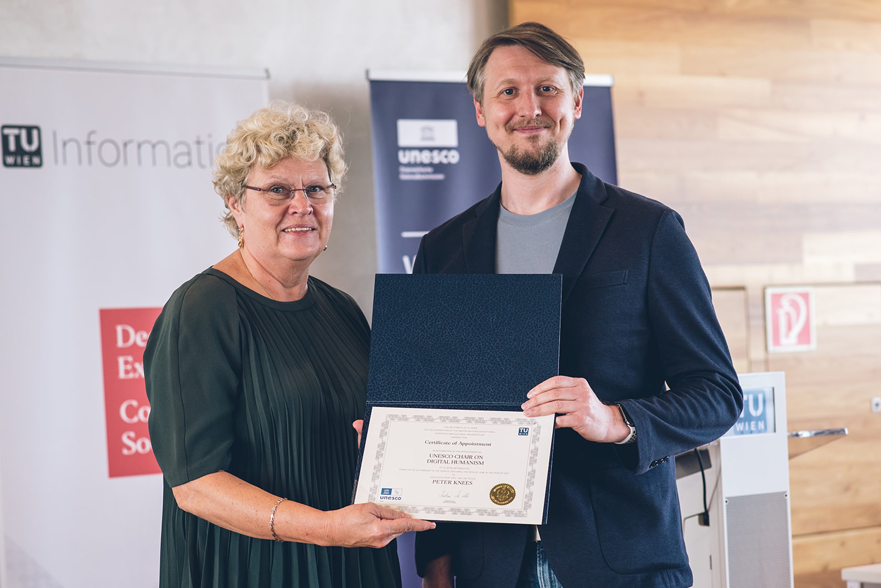 Peter Knees (chair) and Julia Neidhardt (co-chair) were inaugurated as chairholders. Both are AI & Recommender Systems experts and have been active in Digital Humanism for several years. “Technology offers enormous opportunities for society’s development,” says Peter Knees, “but recent developments have increased people’s insecurity about what digital tech means to them. And what it means to be human in this world in general. With the chair, we want to create scientific foundations for meaningful regulations and educate tomorrow’s IT experts with an interdisciplinary mindset.” Peter Knees thanked Digital Humanism pioneer and former Dean of TU Wien Informatics Hannes Werthner, who was crucial for building the initiative and combining multiple international endeavors under the umbrella of ‘Digital Humanism’. “Thanks to Hannes Wertner, Digital Humanism was spotlighted worldwide. Thank you for pushing this important topic and pushing us to strive for more.”